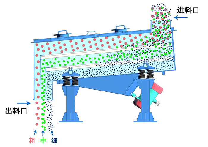 直線篩依靠兩個相同頻率的反向電機(jī)使物料在篩面上直線向前跳躍,小于篩孔孔徑的物料通過篩網(wǎng)落入下層,將原本雜亂無章的顆粒分離,即按粒度分層,形成底部小顆粒、頂部粗顆粒的排列,從而達(dá)到對物料進(jìn)行篩分和分級的目的