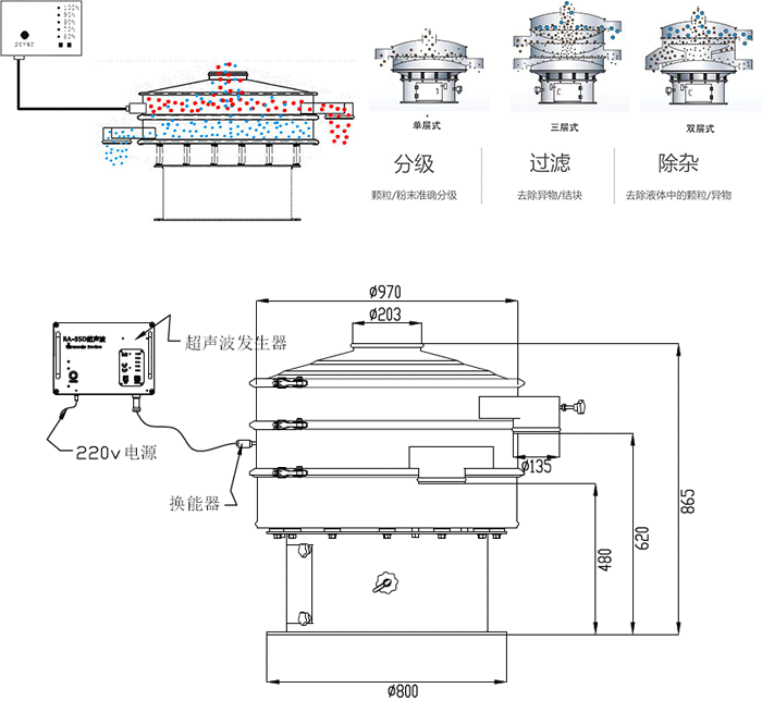 超聲波振動(dòng)篩是在原有的電機(jī)帶動(dòng)振動(dòng)篩振動(dòng)的基礎(chǔ)上,增加了超聲波系統(tǒng)。振動(dòng)篩堵網(wǎng)的問(wèn)題是制約篩分效率的關(guān)鍵,堵網(wǎng)問(wèn)題解決了,其他問(wèn)題就迎刃而解.超聲波裝置是由超聲波電源通過(guò)換能器將超聲波轉(zhuǎn)換為每秒37000次的高頻機(jī)械波作用于篩網(wǎng)表面。來(lái)起到清理篩網(wǎng)的作用。解決了由于篩孔上的靜電附著力,粉末的凝聚作用和插入粗糙網(wǎng)絲表面的微粒而造成的堵塞問(wèn)題。提高了篩分效率。
