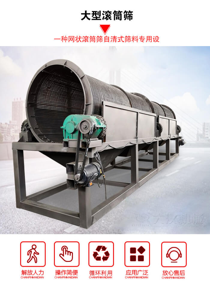 大型滾筒篩,因其獨(dú)特的結(jié)構(gòu)特點(diǎn),完全有效地解決了其他型式篩分設(shè)備所存在的缺點(diǎn),是綜合利用電站的篩型。是繼國內(nèi)各大公司生產(chǎn)的普通型網(wǎng)狀滾筒篩之后的自清式篩料專用設(shè)備。
